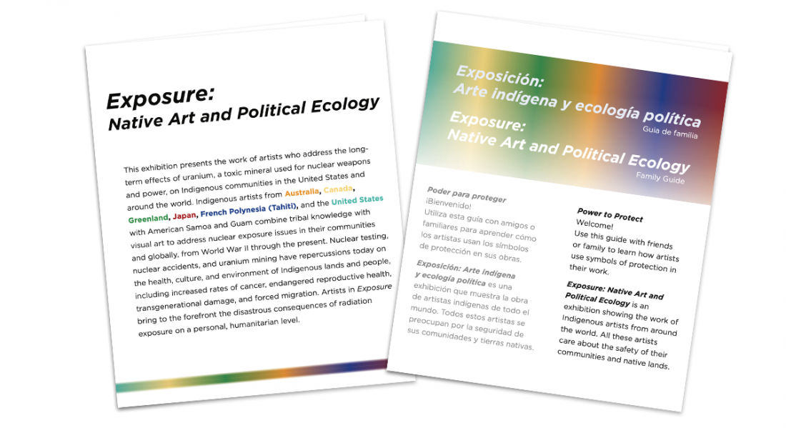 Our Gallery Guide provides the biographies of all the artists involved in this exhibition. Our Family Guide includes a word search, map, art-making activities, and more information for gallery guests. Family Guides are available for anyone and are specially made for kids to have a deeper dive into the artwork. This document is in English and Spanish.